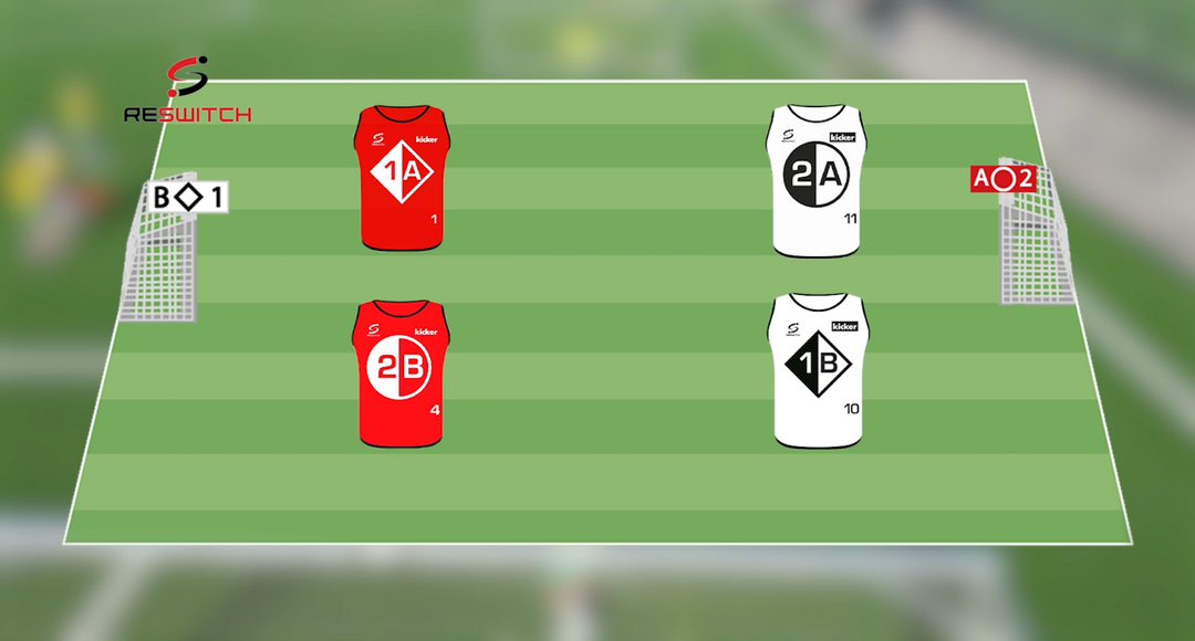 In unserer Ausgangssituation spielen wir in der Kategorie Farbe. Die roten Spieler spielen gegen die Weißen auf das Tor mit den roten Tormarkierungen. Mit dem Wechsel der Teamzugehörigkeit “Switch Buchstabe”, spielen nun die SpielerInnen mit einem A gegen die SpielerInnen mit einem B.